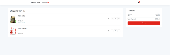 SST is shown for each item. A single cart can include items with different SST rates, and the system will calculate the total accordingly.