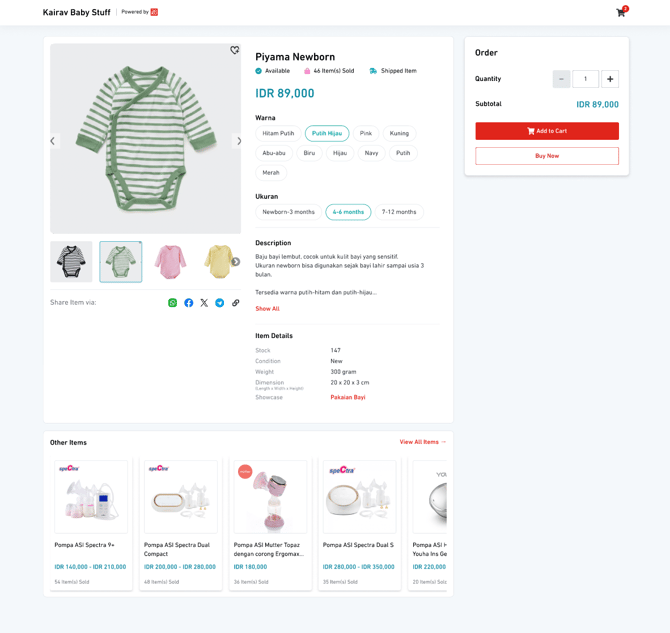 Customers can select their preferred variant (e.g. size, colour) before purchasing. The product image will automatically update based on the selected variant. If variants are available, a selection is required before checkout.