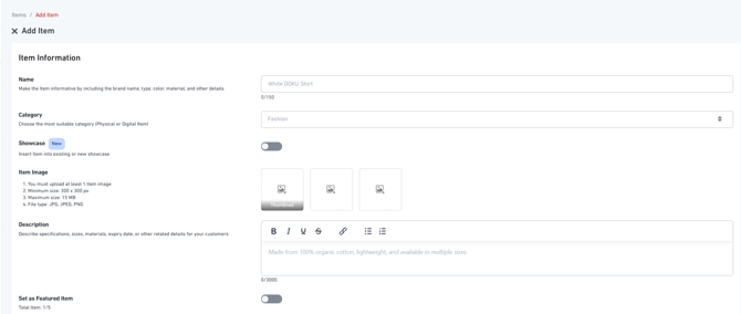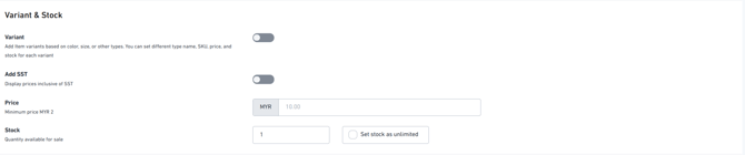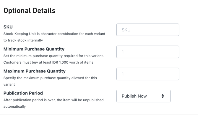 These fields (SKU, Min/Max Quantity) are shown when Variants are not enabled