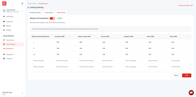 Toggle this ON to apply delivery charges based on your configured rules. When enabled, delivery fees will be automatically calculated based on: